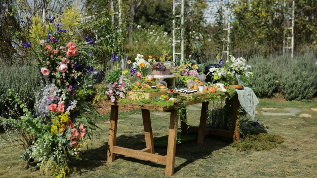 - Garden Party – Floral backdrops, pastel balloon arches, greenery accents, and tea-style food displays create a soft, elegant mood. Add delicate table settings, fresh flowers, and light string lights for a charming outdoor celebration that feels both relaxed and sophisticated.