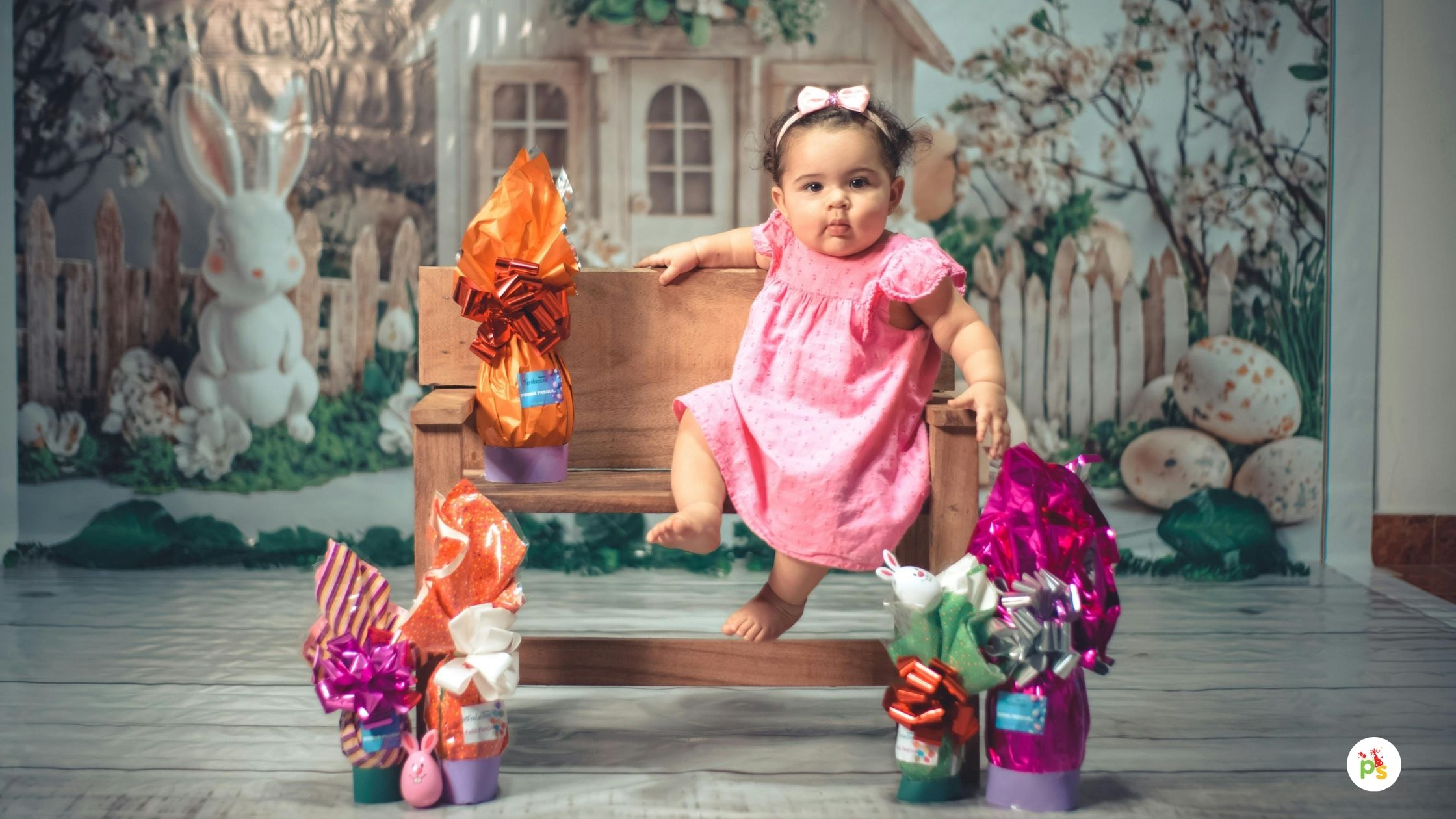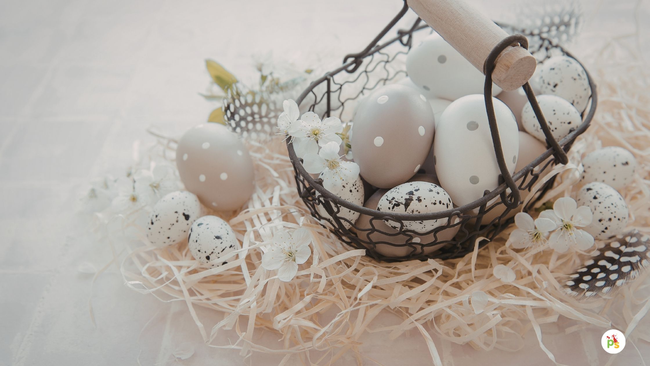 Create a charming outdoor vignette where family and guests can take photos. Use a bench or small outdoor chair as the base. Add a pastel blanket, decorative eggs, a few spring florals, and perhaps a subtle garland backdrop.