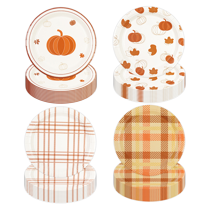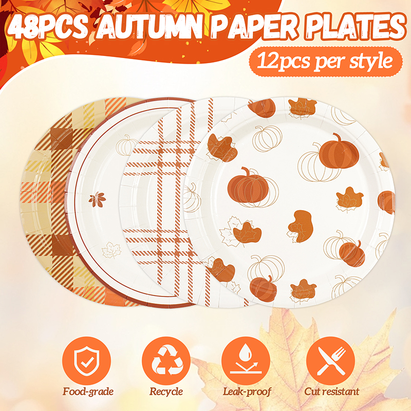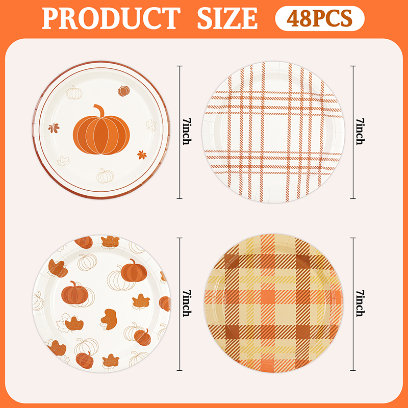 Autumn Paper Plates Pumpkin designs are a strong seasonal product category for wholesalers, distributors, and party supply retailers. This 48Pcs Fall 7inch Paper Plates set features pumpkin and maple leaf dessert plates in four stylish patterns, including classic plaid backgrounds. As a result, it delivers a festive and versatile presentation for fall celebrations.
