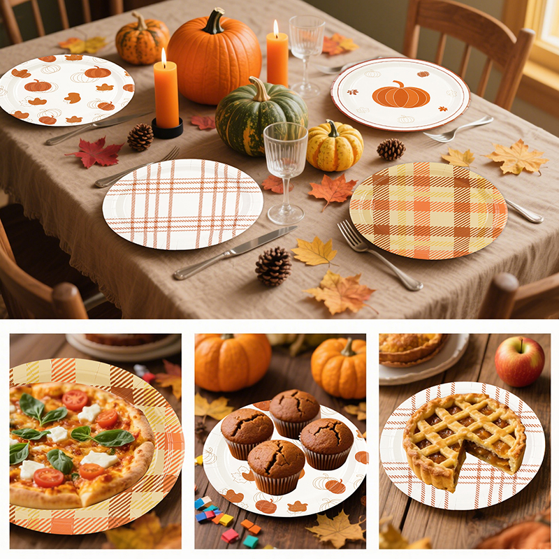 These Autumn Paper Plates Pumpkin sets are manufactured using durable, food-grade paper materials suitable for short-term event use. In addition, advanced printing ensures clear pumpkin graphics and sharp plaid detailing.
