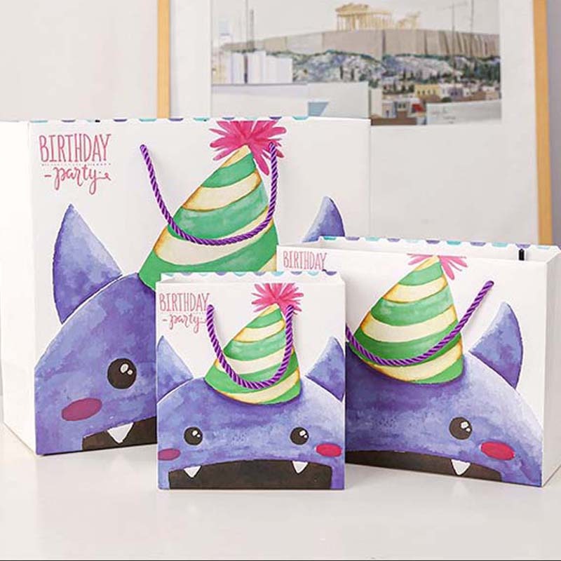 Colorful birthday-themed bags (14cm-30cm) made of durable white cardboard.
