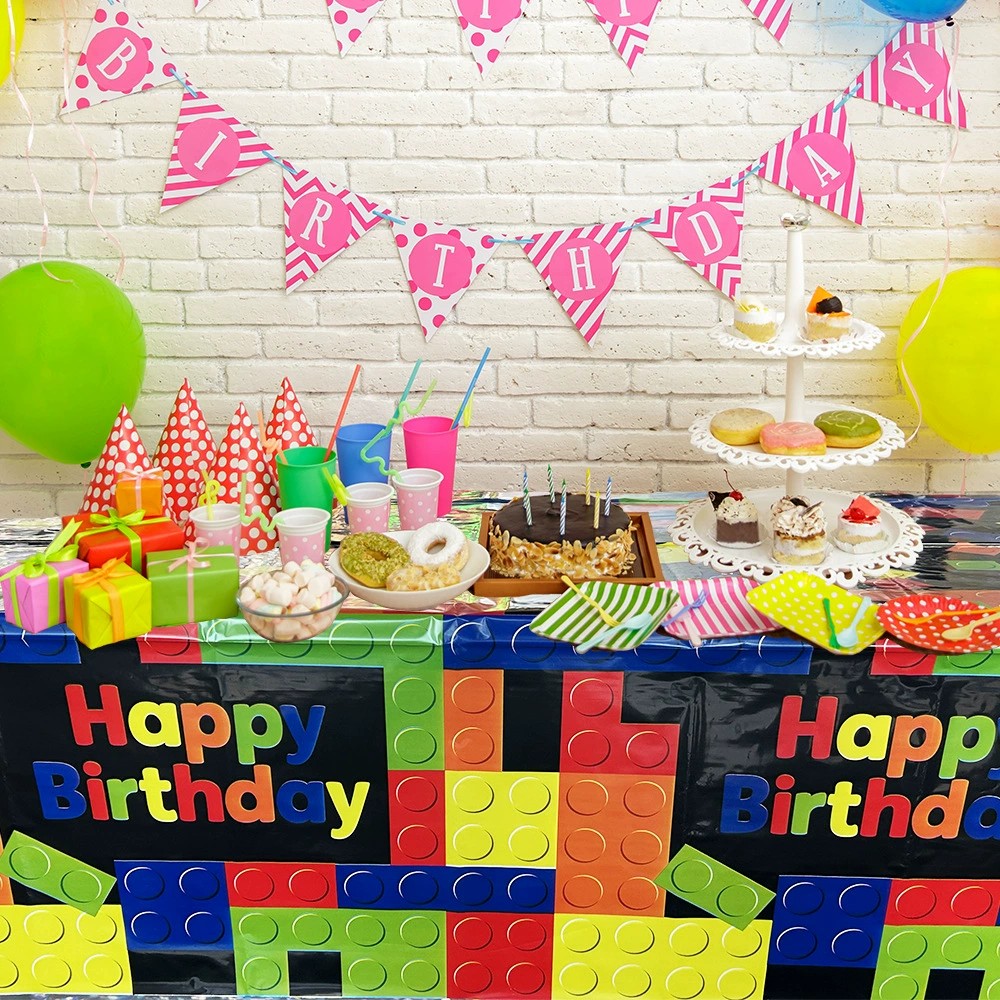 This birthday tablecloth features a colorful building block toy pattern combined with “Happy Birthday” text. The bold shapes and vivid colors create a cheerful look that resonates strongly with children and parents alike.