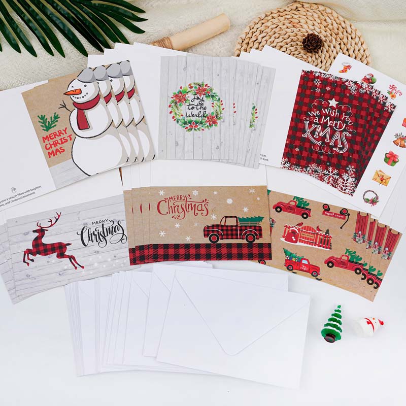 Christmas card sets are widely used for family greetings, office holiday wishes, school exchanges, retail promotions, and corporate seasonal communication. This product is especially suitable for stationery stores, gift shops, bookstores, party supply retailers, and online sellers looking to offer ready-made holiday solutions. Furthermore, the bright and festive designs appeal to a broad audience, making the set suitable for different age groups and cultural markets.