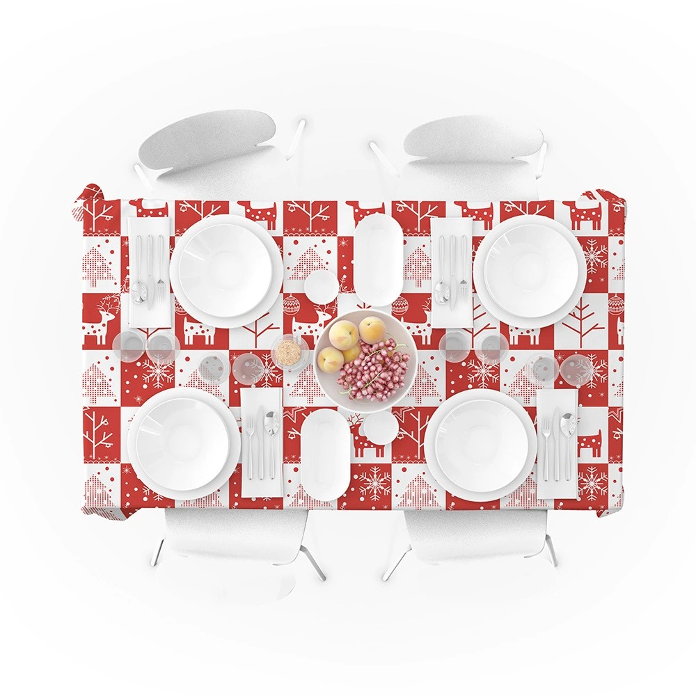 This christmas tablecloth features a charming holiday pattern with reindeer, Christmas trees, snowflakes, and seasonal elements. These classic visuals help create a warm and joyful atmosphere, which fits perfectly with traditional Christmas décor themes.