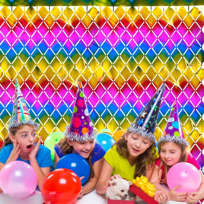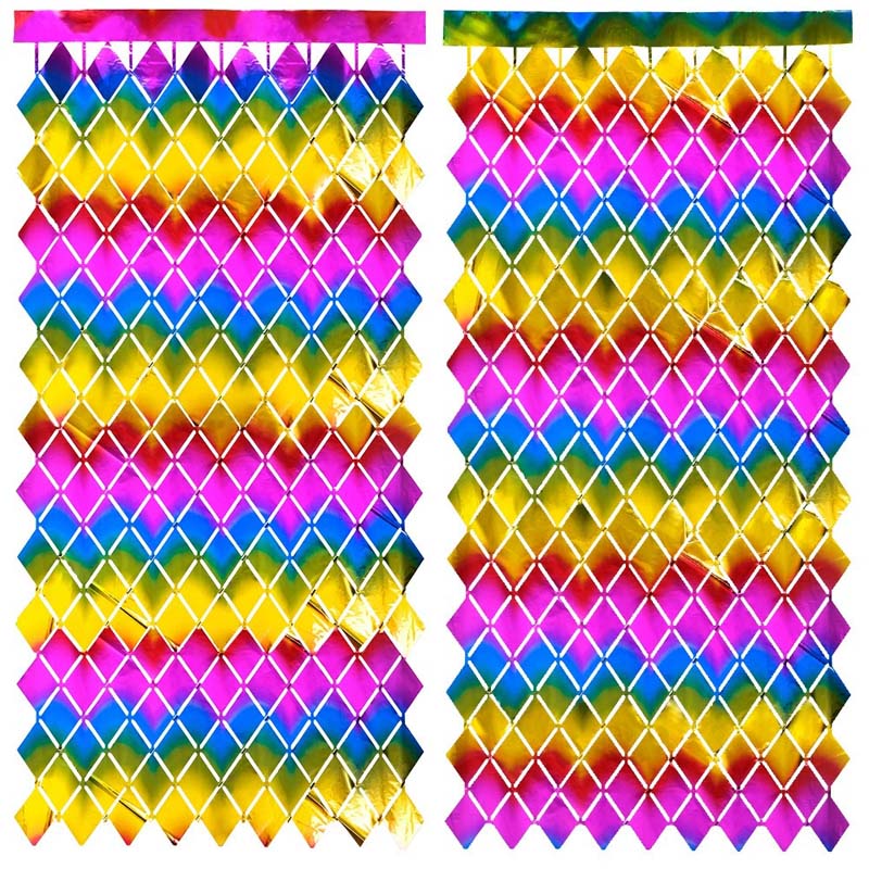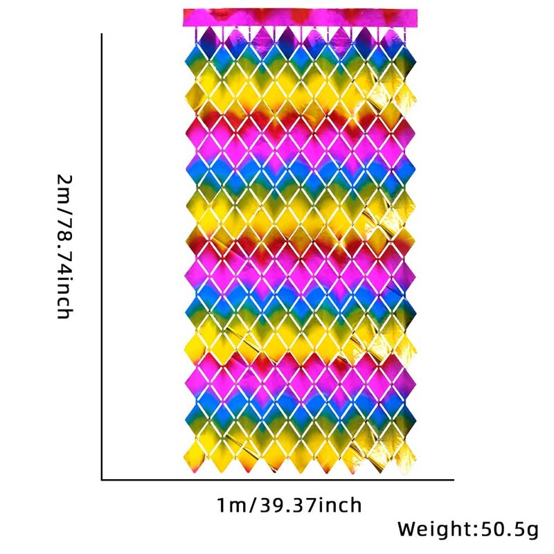 This diamond-shaped rain curtain showcases sparkling diamond motifs on metallic fringe strands. In addition, the vibrant colours transition smoothly, adding depth and shine to decorations. Because of this, the curtain is ideal for party entrances, photo backdrops, and stage decorations.