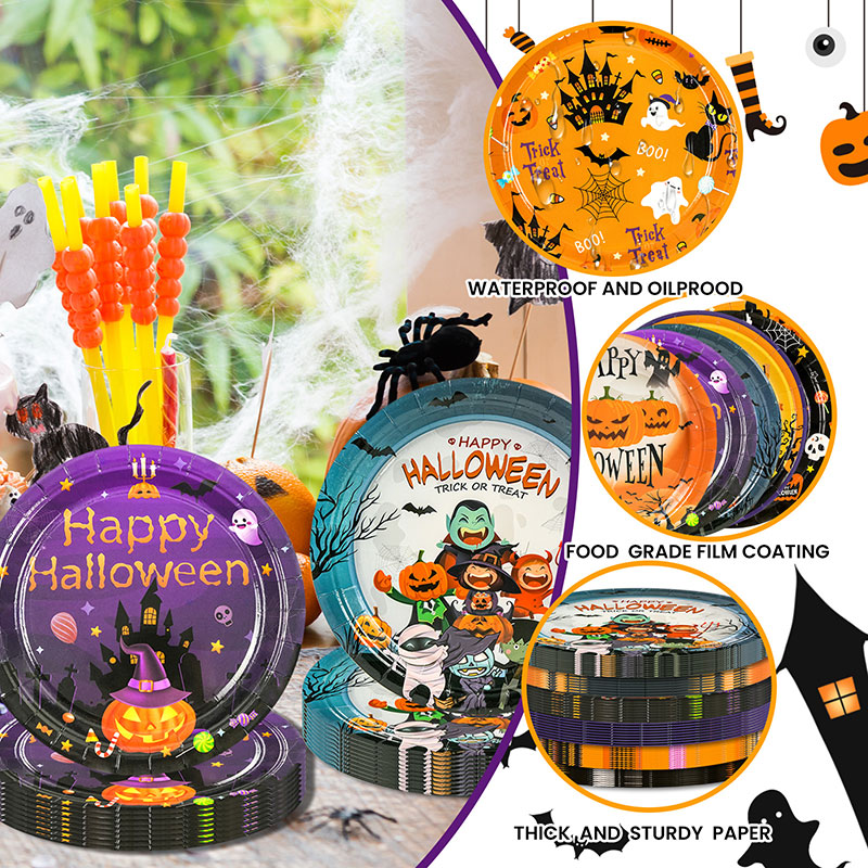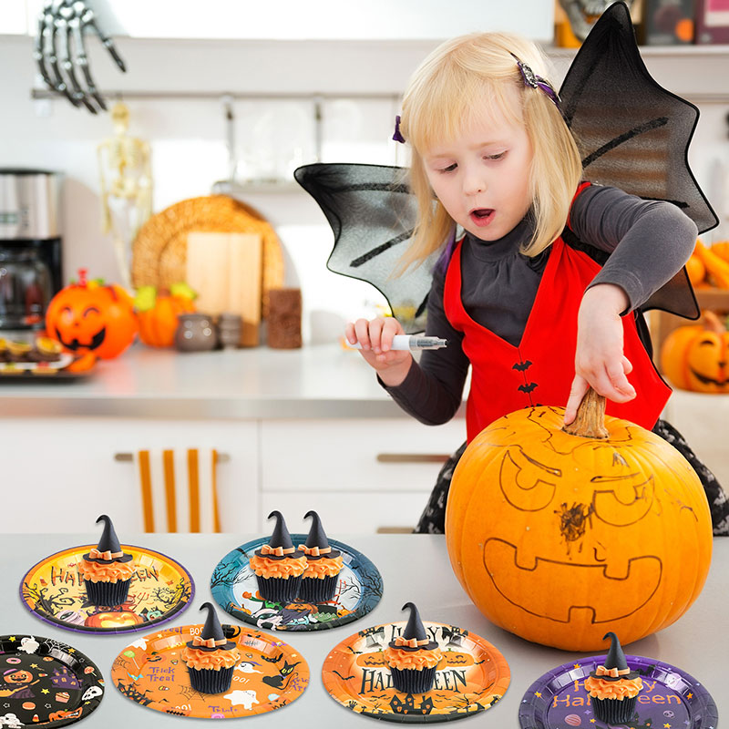 These Halloween paper plates and spooky halloween paper plates showcase six different spooky designs, including pumpkin, monster, bat, skull, and ghost patterns. As a result, they bring variety and visual appeal to party tables. In addition, the playful artwork matches well with other Halloween decorations and party supplies.