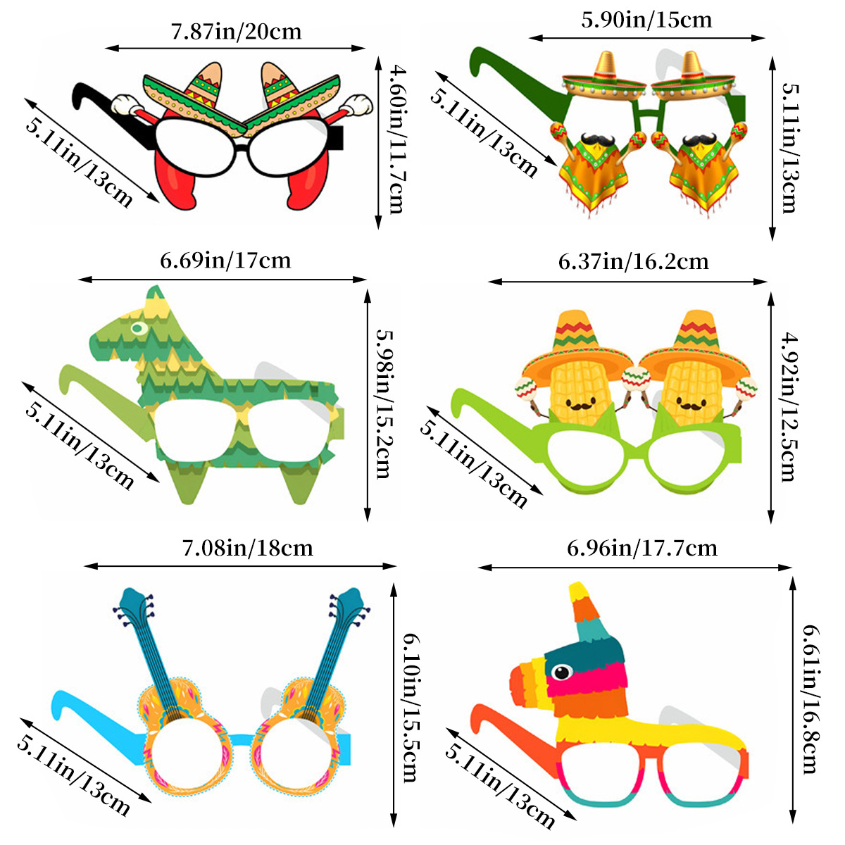These FIESTA Festival Party Theme Paper Glasses feature colorful designs inspired by traditional Mexican culture. Moreover, the graphics include sombreros, piñatas, guitars, and other festive elements that instantly communicate a fun and energetic theme. Because of this detailed artwork, the glasses stand out as both wearable accessories and decorative props.