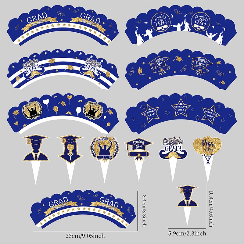 This graduation cake decorations set is available in multiple color versions to meet different market preferences. Each version includes both wrappers and toppers designed for standard cake sizes.