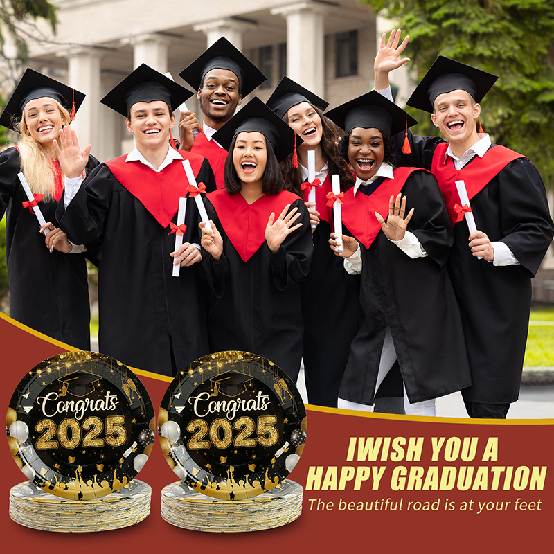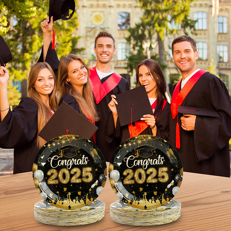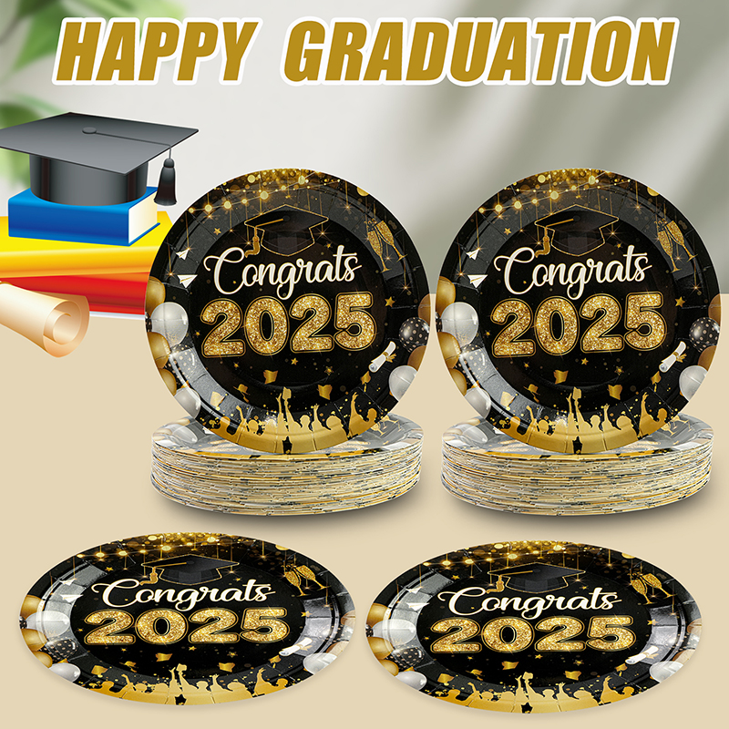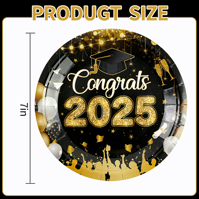 50Pcs 7-Inch Graduation Paper Plates. Elegant black and gold design with “Congrats 2025” text and confetti patterns. Perfect disposable tableware for graduation parties and commencement celebrations.
