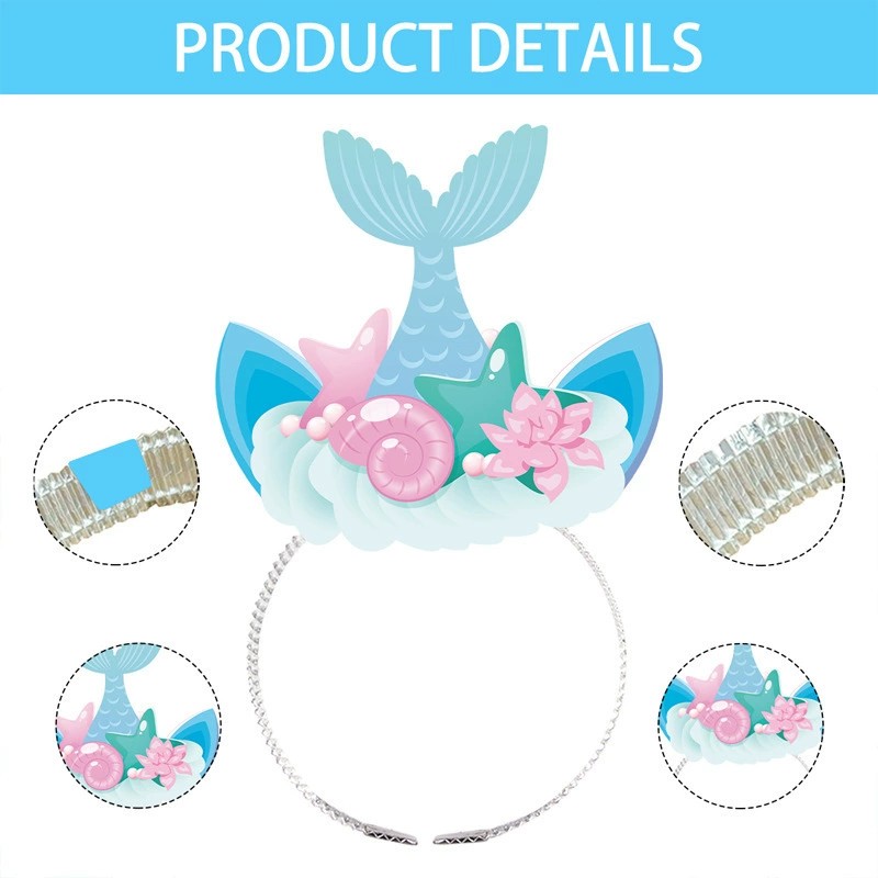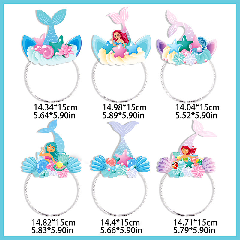 This mermaid party headband set features delightful undersea motifs such as mermaid tails, seashells, starfish, and mermaid characters. Each design reflects a soft ocean theme that pairs easily with other mermaid party decorations.