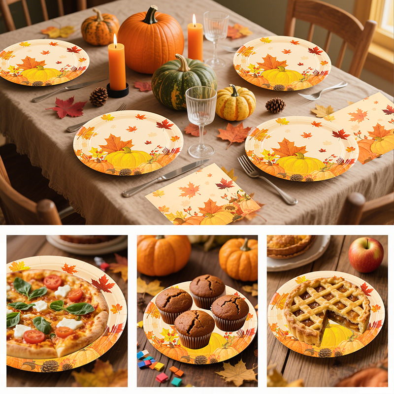 Pumpkin Paper Plates are a high-demand seasonal product for wholesalers, distributors, and party supply retailers. This 50PCS Fall Maple Leaves Paper Plates and Napkins set is designed for Thanksgiving, harvest celebrations, autumn birthdays, and seasonal gatherings. Featuring warm fallen leaf patterns and pumpkin motifs, it delivers a festive and welcoming table presentation.