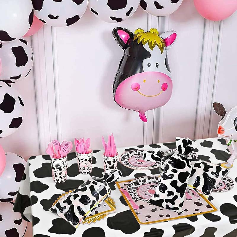 This plastic tablecloth features a cute pink cow – print pattern.