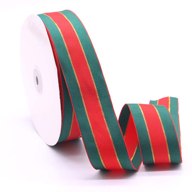This striped ribbon features traditional red and green color bands accented by a refined gold trim. The striped pattern adds structure and visual rhythm, while the metallic edge enhances the overall finish.